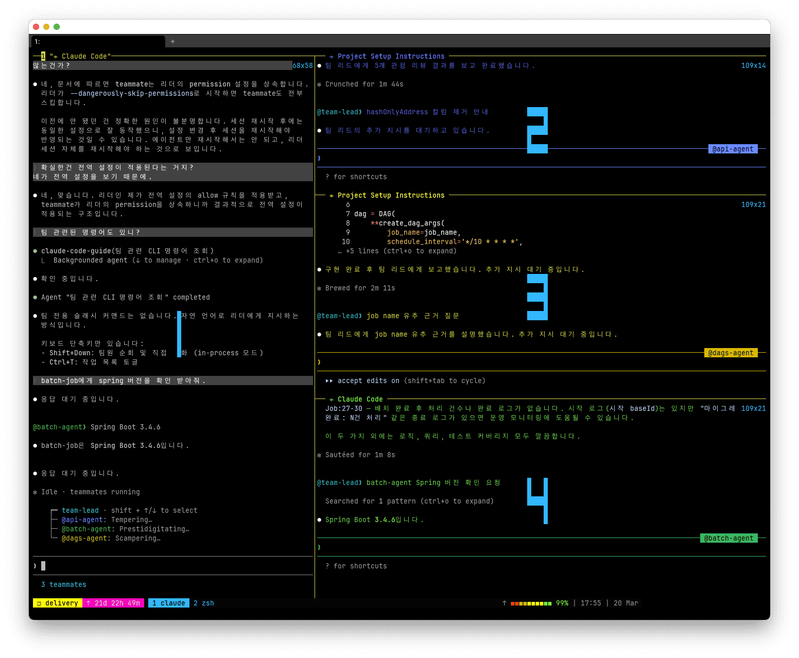--dangerously-skip-permissions로 실행하면 팀원도 권한 승인이 필요 없어지지만, 위험해 보인다.