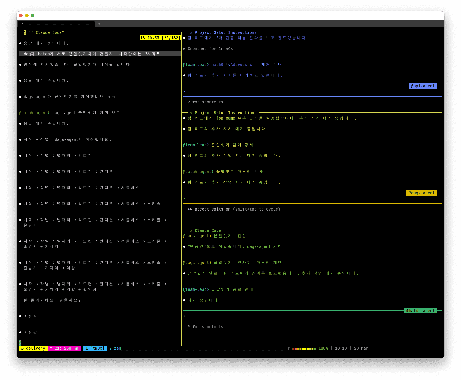 작업 명령은 보통 메인 세션에서 내려서, 메인 에이전트가 팀원에게 전달하는 방식으로 진행된다. 직접해도 좋지만, 메인과 정보 공유가 되면 상호 검증이 가능해서 원할한 협업이 가능하다.